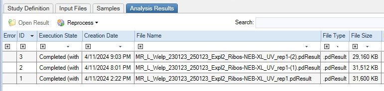- Result files are not exported automatically. All results are listed under the Analysis Results tab. You can view your results in Proteome Discoverer by double-clicking the result file.