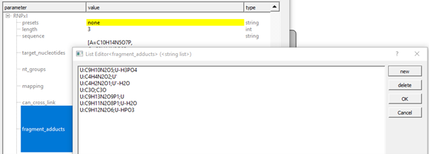 noneinPresets. You can then defineFragment adductsandModificationsin advanced parameters according to your protocol in the following format:[target nucleotide]:[formula]or[precursor adduct] ->[fragment adduct formula];[name]. NuXL will use this information to generate all chemically feasible precursor adduct and fragment adduct combinations. Cross-link identification->Can cross-link: If you expect only a single or subset of nucleotides to be amenable to crosslinking, set this up here. Nucleotides are specified by their one-letter code without a separator (e.g. UA for U and A nucleotides)Cross-link identification->Cysteine adduct: If DTT is present during UV irradiation, it can generate additional crosslinks including a 152 Da linker. For more information see 1. If needed to be identified, we recommend specifying the composition of the linker in modifications and ‘Fragment adducts’ instead. Set this flag to true, if the 152 adduct is expected.Cross-links->Target nucleotides: Sum formulas of the target nucleotides of the crosslink. Heavy labeled atoms are specified with parenthesis in front with the nominal mass of the respective isotope (e.g. (13)C, (15)N).