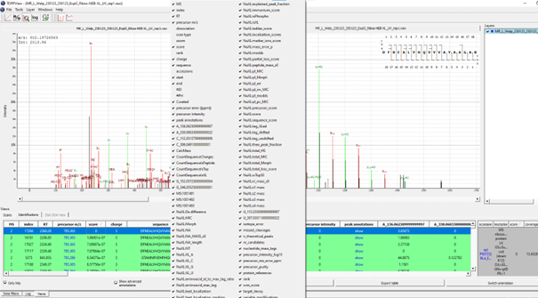 If executed on .raw files, the OpenNuXL node will create corresponding .mzML files in the output directory (defined as in Figure Output Directory). For visualization of annotated spectra, open .mzML files in TOPPView. By default, double-clicking on .mzML files should automatically open the file in TOPPView. Once it is loaded, spectrum annotations matched by OpenNuXL can be added by loading .idXML files generated by the tool. Select: ‘Tools’ -> ‘Annotate with peptide identifications’. See Figure Annotated MS2 Spectrum for an annotated MS2 spectrum of a UV-crosslinked peptide-RNA(oligo)nucleotide. To add/remove columns of the result grid ‘identifications’ below the spectrum window, right-click on the column header and a list of potential columns appears that you can choose from (Figure Custom columns).