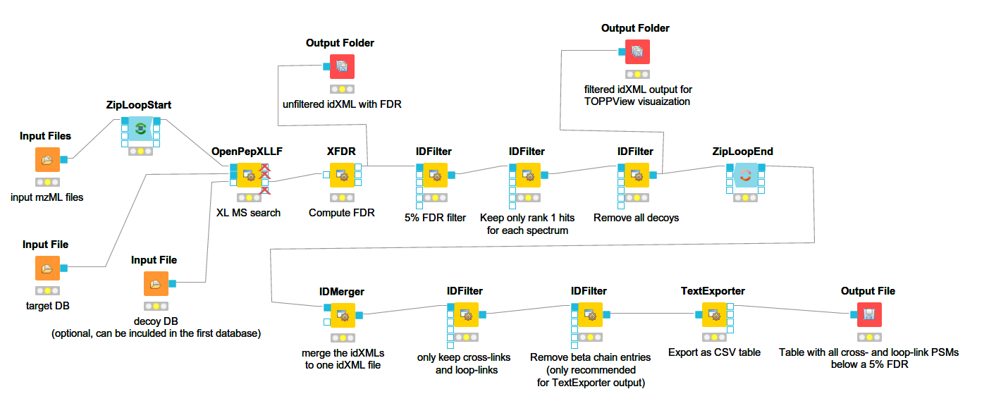 Below you can see a more complex workflow with FDR estimation and additional filtering. This is a label-free OpenPepXL workflow available for download at the OpenMS 2.5 page.